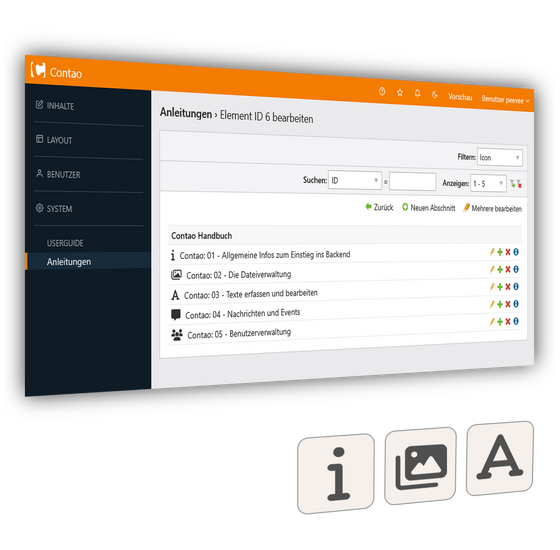Mit UserGuide stellen Sie Ihren Redakteuren, Teams oder Kunden leicht verständliche Anleitungen direkt im Contao-Backend zur Verfügung – übersichtlich strukturiert, individuell gestaltbar und jederzeit erweiterbar. Die Inhalte können in Kategorien organisiert, gegliedert und optisch mit Icons versehen werden.