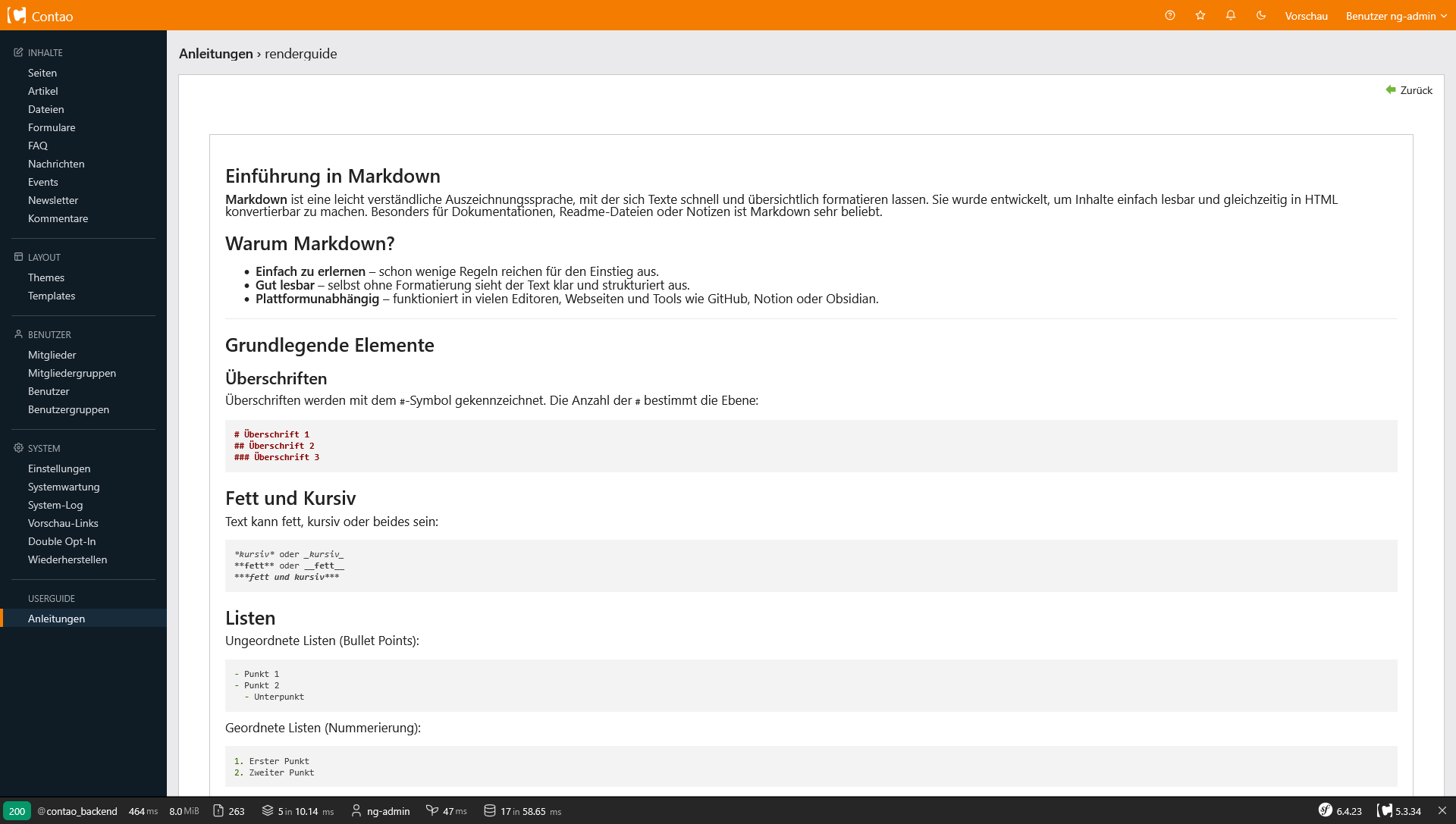 Eine Anleitung besteht aus mehreren in Contao verwalteten Abschnitten, die in Markdown verfasst und mit InsertTags für dynamische Inhalte wie Bilder oder Links ergänzt werden können.